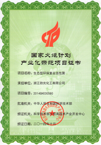 经中华人民共和国科技部审批,“劲光”牌生态型环保复合活性黑被授予“国家火炬计划产业化示范项目” ,项目编号为2014GH030582。