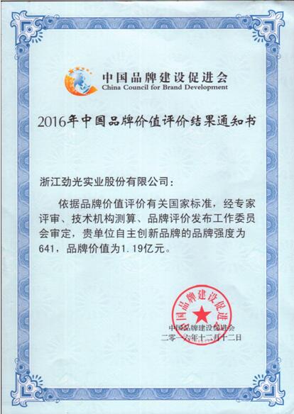 根据中国品牌建设促进会依据品牌价值评价有关国家标准,经专家评审、技术机构测算、品牌评价发布工作委员会审定,“劲光”自主创新品牌的品牌强度为641,品牌价值为1.19亿元。“劲光”商标被授予予浙江省著名商标,“劲光”商号被评为浙江省知名商号,“劲光”牌活性染料被认定为浙江省名牌产品。标志着“劲光”品牌社会认可度高,品牌效益显著。