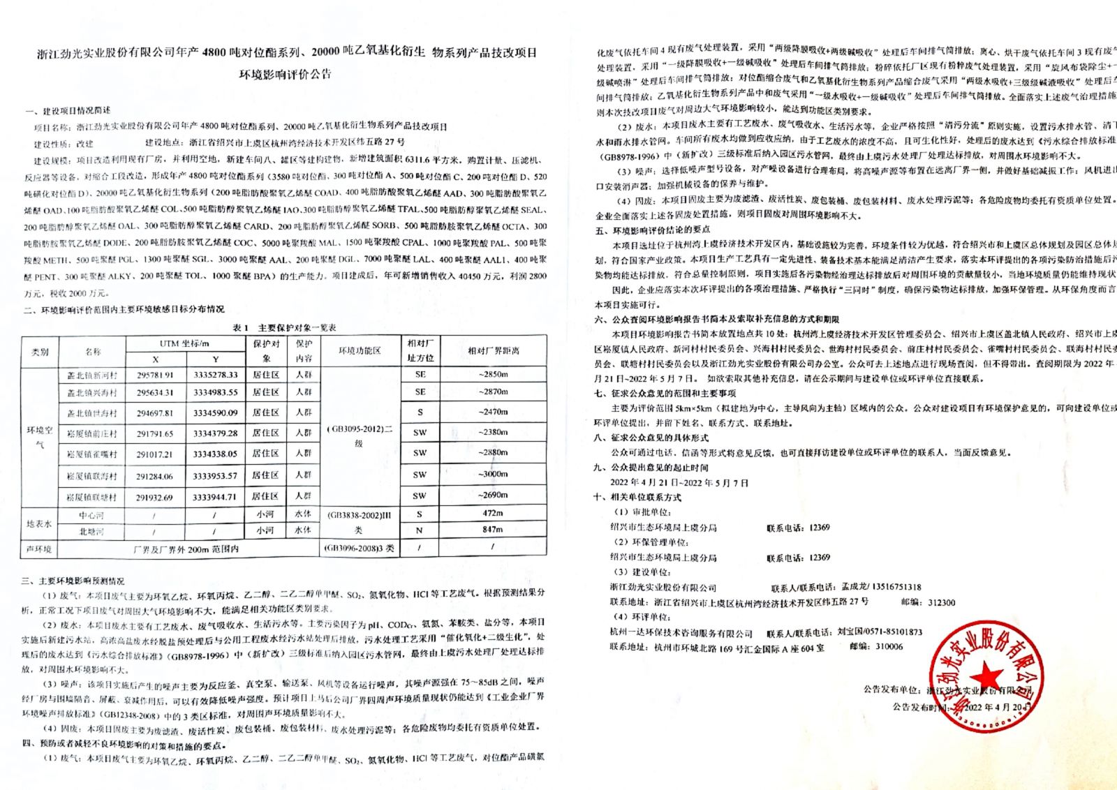 浙江劲光对位酯、乙氧基化衍生物系列产品技改项目环境影响评价公告