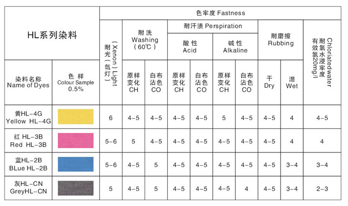 HL系列染料是我公司最新研发的高是晒、高污渍、高水洗牢度系列中和一组特色染料,适合于天然纤维素纤维及人造纤维及人造纤维素纤维像天丝、粘胶织物的敏感色染色,具有非常高的经济实用性。主要用于浸染、轧染等染色工艺,与市场同类产品相比,该组染料更具有优异和条花覆盖染色性能和低成本和经济价值。