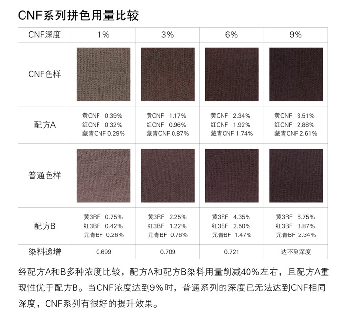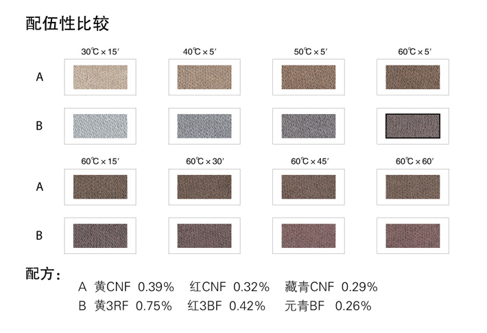 适用于浅中敏感系列染色,三原色亲和力相近,染色工艺宽容性大,可大大提高染色的一次成功率。改进了原有系列产品染色着色率低的缺陷,有效的降低了终合生产成本,该系列产品色谱使用范围较广,适应于浸染、轧染、连续轧染、冷轧堆等工艺。