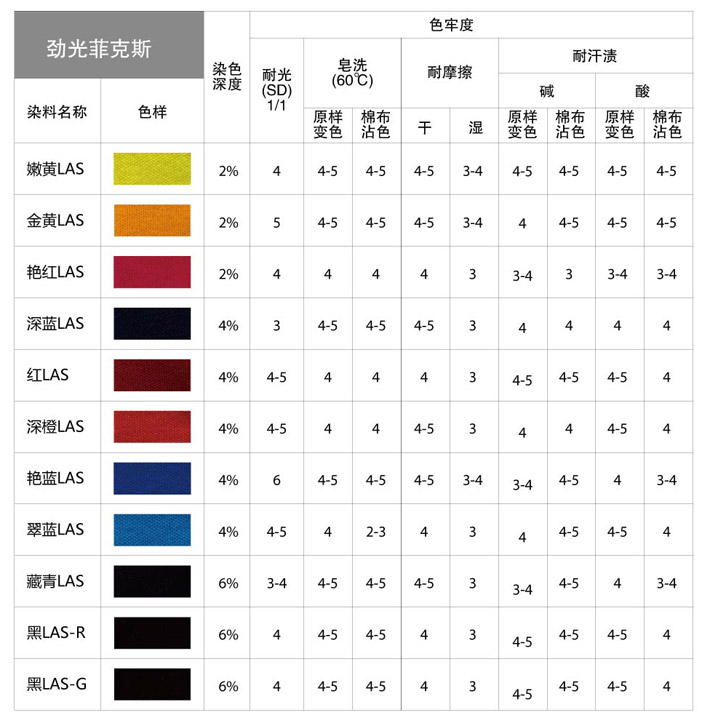 LAS系列产品是我公司近期研发成功的低碱型活性染料,适用于纤维素纤维和染色,具有非常高和经济实用性。主要适合于浸染工艺,该系列具有优异的染色性能: