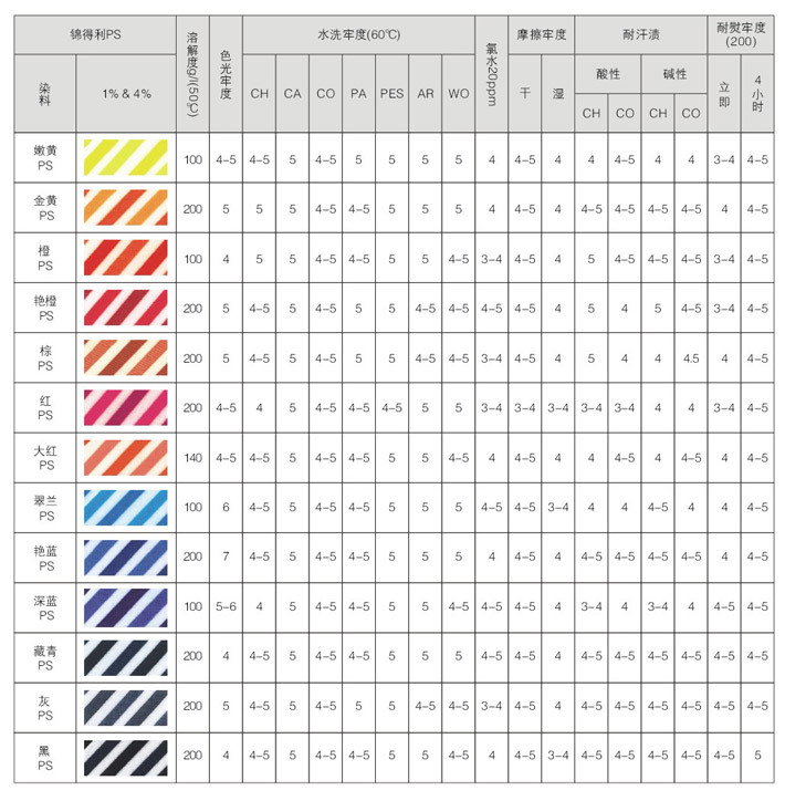 锦得利PS活性印花染料为一氯均三嗪和乙烯砜基和高反应性活性染料,其混合型双活性基团,在102-105°C饱和蒸汽和弱碱性介质条件下,能与纤维素分子形成共价键结合而实现固着。