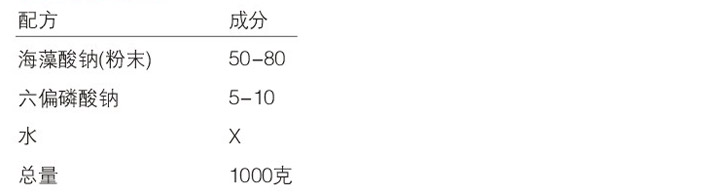 在容器中放入冷水,慢慢放入六偏磷钠和海藻酸钠粉末(海藻酸酯),并不停搅拌直到完全溶解。再加入水并搅拌直到糊料透明,用纯碱或醋酸调节PH到中性即可。