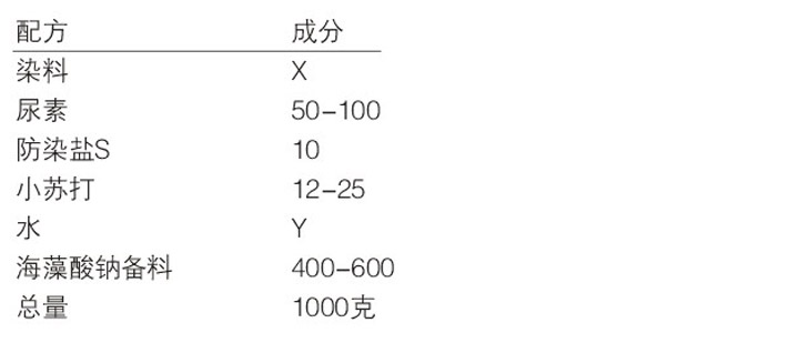 在少量冷水中放适量染料并搅拌,放入尿素和防染盐S,加入60°C左右的温水直到完全溶解。染料溶液用筛网滤入糊料中并搅拌。在印制前把溶解好和小苏打放入染料糊料中即可。