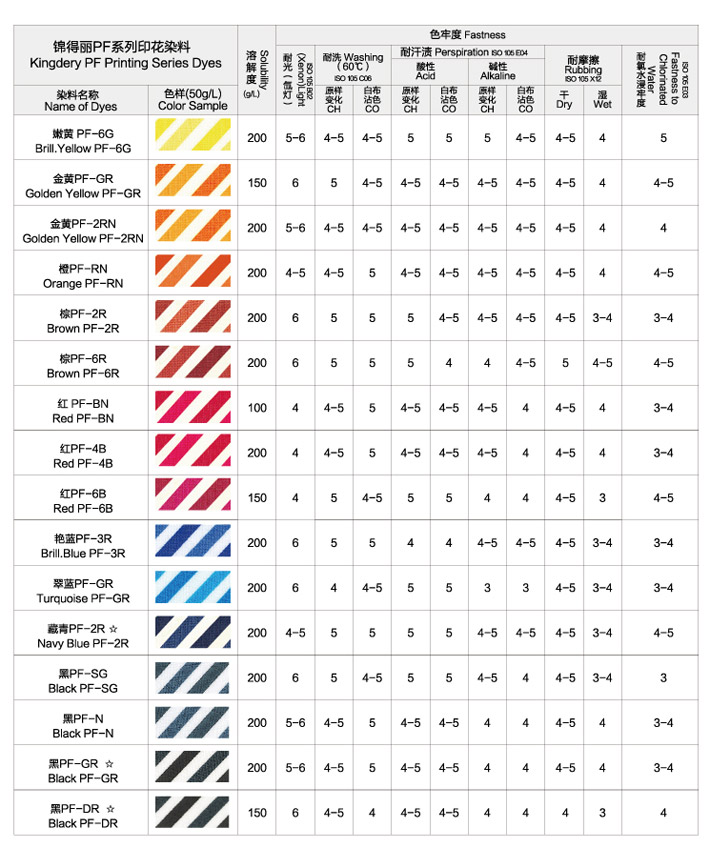 锦得丽PF系列是我司和印花染料,该系列染料具有很高的溶解度、固色率和提升率,以及极佳和色牢度。印花色浆稳定性好,宽容性大,颗粒状超强的溶解性更适合自动调浆机使用,适合以纤维为主和纺织品印花和连续染色。