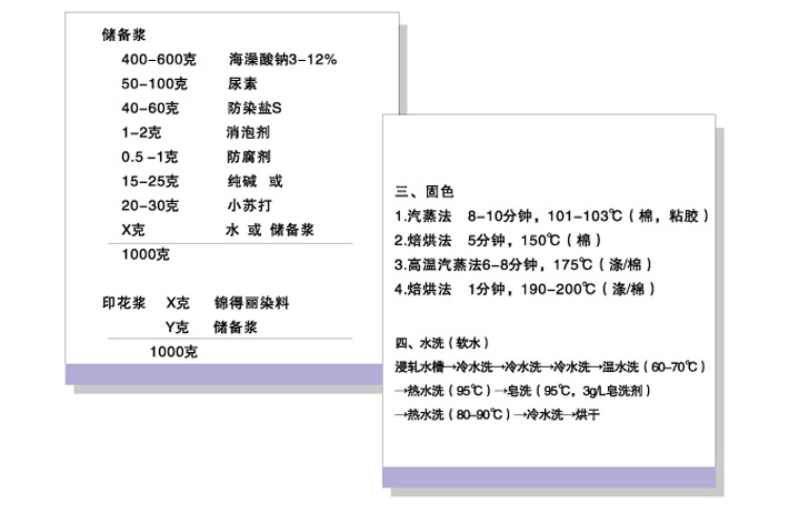 为达到最佳印花效果。必须加强织物和前处理。除去残留在纤维内和杂质(如油、蜡质、果胶和其他助剂),发免这些杂质阻碍活性染料和纤维素纤维和反应或给带来不良影响。